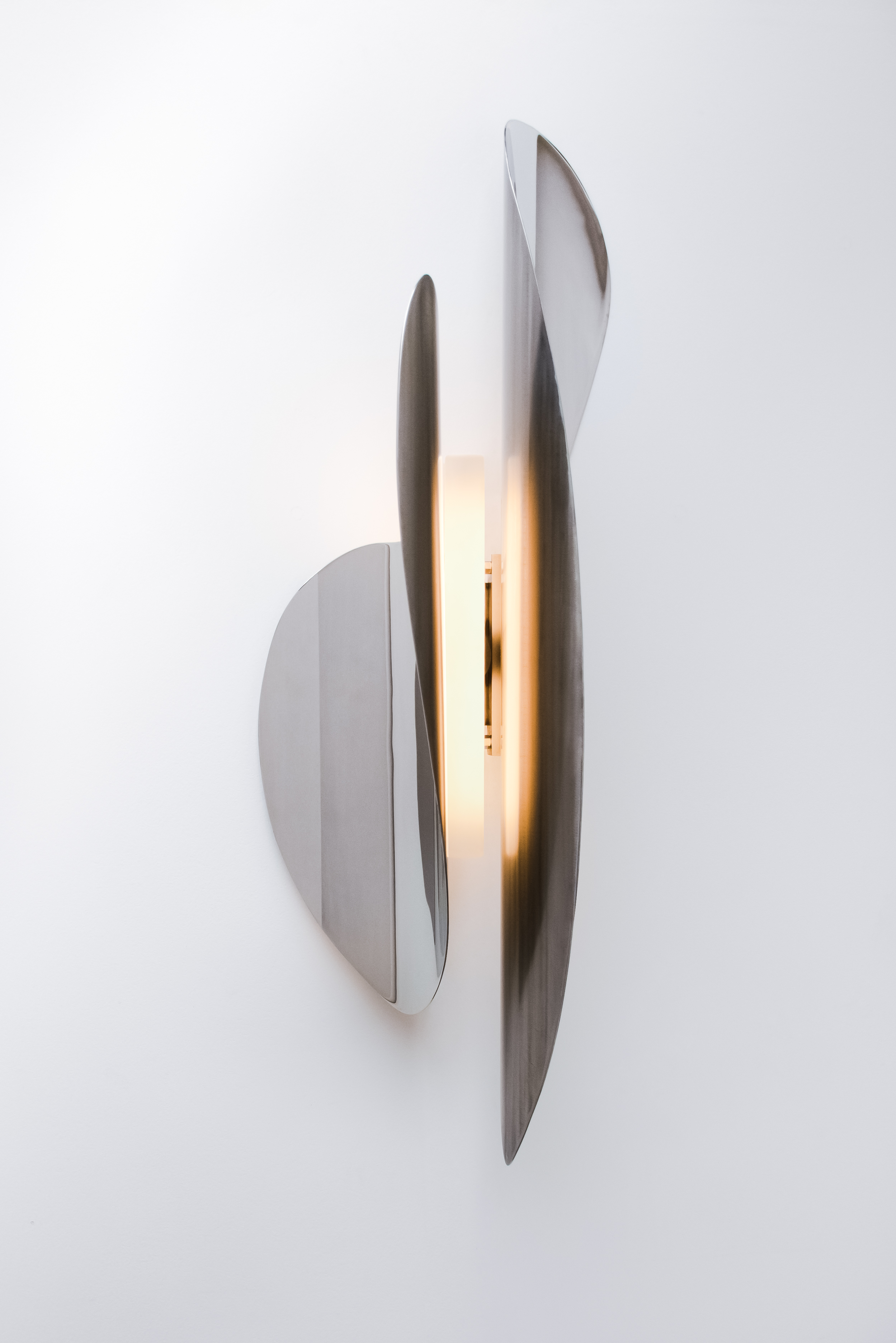 This stainless-steel wall light explores the movement of unfolding - the opening of wings, the revealing of light, the way metal comes alive through curvature. Its silver glow emanates from a luminous core, playing with reflections and shadows in a subtle tension between fragility and precision.