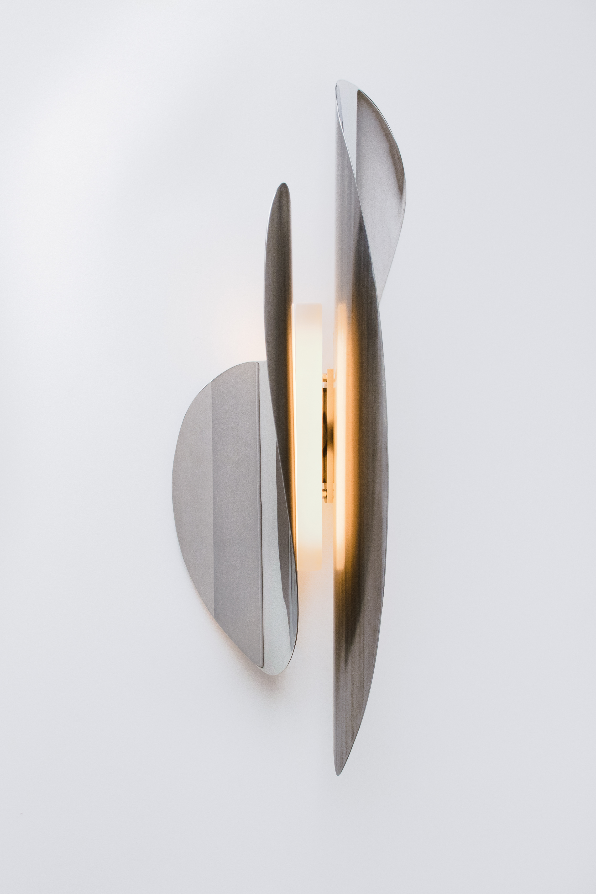 This stainless steel wall light explores the movement of unfolding — wings opening, light revealing itself, metal coming alive through the curve.